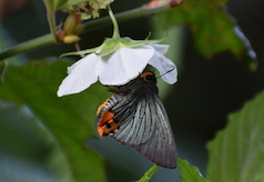 | ▲1頭(ヒカンザクラの花で吸蜜)恩納村 2012年2月14日 | ▲♂(鳥糞を吸っている)国頭村 2013年5月18日 | ▲♀(キバナランタナの花で吸蜜)本部町 2013年7月15日 | ▲1頭(カクレミノの花で吸蜜)今帰仁村 2013年8月27日(新田敦子) |